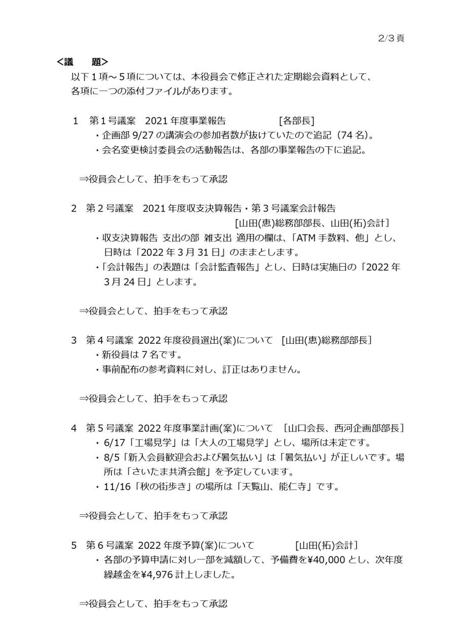 ※ 上記議事録中の定期総会議案書は、「2021年度 定期総会議事録」のコラムをご覧願います。